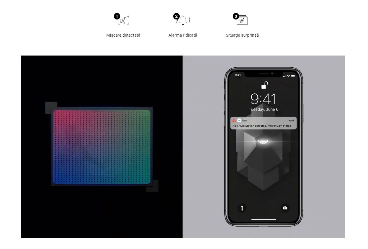 MotionCam este conceput pentru a vă controla securitatea, nu viața personală. Detectorul de mișcare nu poate face fotografii la cerere. Camera se activează numai ca răspuns la o alarmă de mișcare. Datele sunt criptate pe parcursul proceselor de transmitere și stocare. Nimeni nu o analizează, nici măcar AI. Nu va trebui să trăiești sub supravegherea constantă a camerelor de securitate pentru a ști de ce a declanșat alarma.