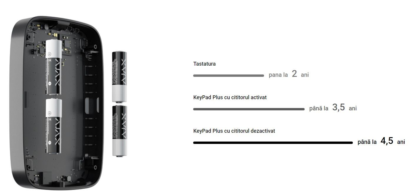 Firmware-ul complet nou KeyPad Plus profită la maximum de bateriile preinstalate. Chiar și cu utilizarea zilnică a funcției de identificare fără contact, tastatura va funcționa timp de 3,5 ani fără a înlocui bateriile. Și cu cardul și cititorul de chei dezactivate, durata de viață a bateriei ajunge la 4,5 ani. KeyPad Plus va avertiza o stație de monitorizare și utilizatorii în avans cu privire la necesitatea înlocuirii bateriilor.
